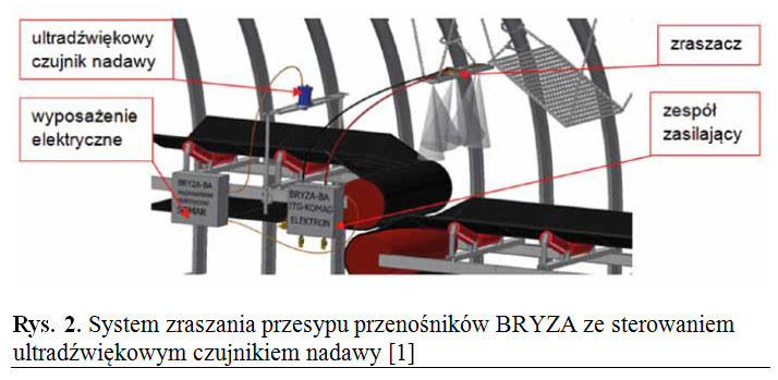 Urządzenie zraszające ORKAN może być również wyposażone w hydrauliczny zawór sterujący, dzięki któremu jego włączenie i wyłaczenie odbywa się automatycznie, w zależności od ruchu i obciążenia urobkiem taśmy przenośnika.Powietrzno-wodny system zraszający BRYZA, również opracowany w ITG KOMAG i produkowany przez firmę FI-W Elektron s.c., charakteryzuje się niskim zużyciem wody, wynoszącym ok. 30 dm3/h, dla instalacji składającej się z 4-6 dysz. System może być rozbudowany o automatyczne sterowanie z zastosowaniem hydraulicznego zaworu sterowanego rolką lub ultradźwiękowego czujnika nadawy (rys. 2).
