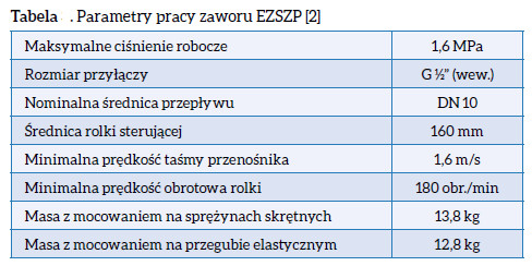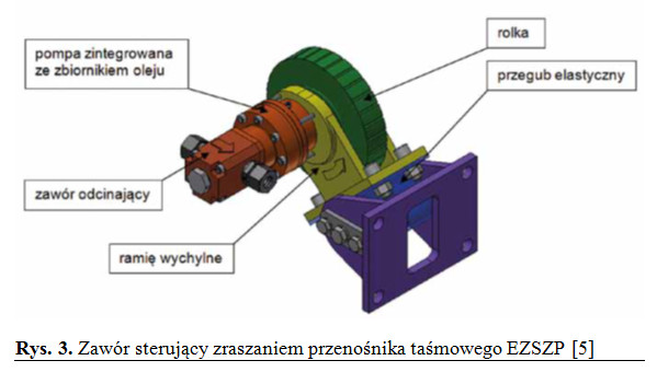 Automatyczne sterowanie instalacją zraszającą przy pomocy zaworu hydraulicznego z rolką ma szereg zalet. Nie wymaga zasilania elektrycznego układu sterowania zraszania oraz stosowania urządzeń z certyfikatem ATEX EX I, znacznie podwyższajęcych cenę instalacji. Elementy zaworu sterowanego rolką nie ulegają nadmiernemu zużyciu. Zawór sterujący zraszaniem przenośnika taśmowego EZSZP opracowano w celu sterowania przepływem medium za pomocą rolki, w instalacjach, w których ciśnienie medium nie przekracza 1,6 MPa. Jest to zawór odcinający, normalnie zamknięty. Otwarcie zaworu powoduje ruch obrotowy rolki, napędzanej przez taśmę przenośnika. Otwarcie zaworu może być również inicjowane obecnością urobku na taśmie. Zawór EZSZP (rys. 3) mocowany jest do konstrukcji przenośnika na wychylnym ramieniu, które z jednej strony jest osadzone na spręynach skrętnych lub przegubie elastycznym, a z drugiej strony posiada zabudowaną w nim rolkę, identyfikującą ruch taśmy przenośnika. W osi rolki osadzony jest wał przenoszący napęd na pompę zębatą, zintegrowaną ze zbiornikiem oleju. W kadłubie pompy umieszczony jest kanał tłoczny, którym olej dostaje się pod tłok, sprzężony z elementem sterującym zaworu odcinającego przepływ medium zraszającego.