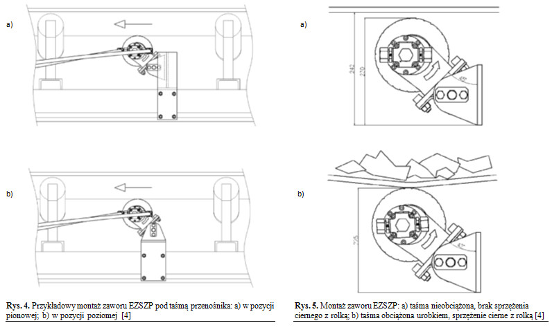 W momencie ruchu taśmy przenośnika następuje obrót rolki, która przekazuje napęd na pompę. Pompa zasysa olej ze zbiornika i przetłacza go pod tłok. Tłok pod wpływem ciśnienia oleju przesuwa się, powodując otwarcie zaworu odcinającego przepływ medium zraszającego. Z chwilą zatrzymania ruchu taśmy przenośnika następuje unieruchomienie rolki zaworu, pompa przestaje pracować, spada ciśnienie oleju pod tłokiem, co powoduje zamknięcie zaworu odcinającego. Konstrukcja wspornika zaworu z przegubem elastycznym umożliwia mocowanie zaworu pionowo i poziomo. Przykładowy pionowy montaż zaworu sterowanego ruchem taśmy przenośnika pokazano na rys. 4a, a poziomy na rys. 4b. Prawidłowa praca zaworu wymaga zamocowania go we właściwej odległości od taśmy. Sprzężenie cierne rolki zaworu z taśmą przenośnika następuje pod wpływem ciężaru urobku (rys. 5). W przypadku niewielkich odkształceń taśmy otwarcie przepływu uzależnione jest tylko od ruchu taśmy, a obciążenie urobkiem jest nieuwzględnione. Zawór sterujący zraszaniem przenośnika wdrożono m.in. w instalacji zraszającej Bryza 1200 w KWK Knurów, ruch Szczygłowice.